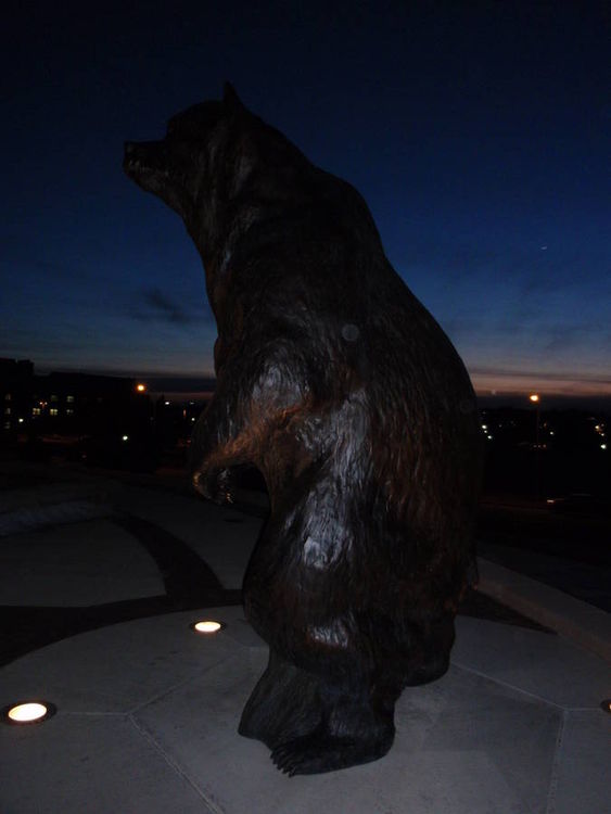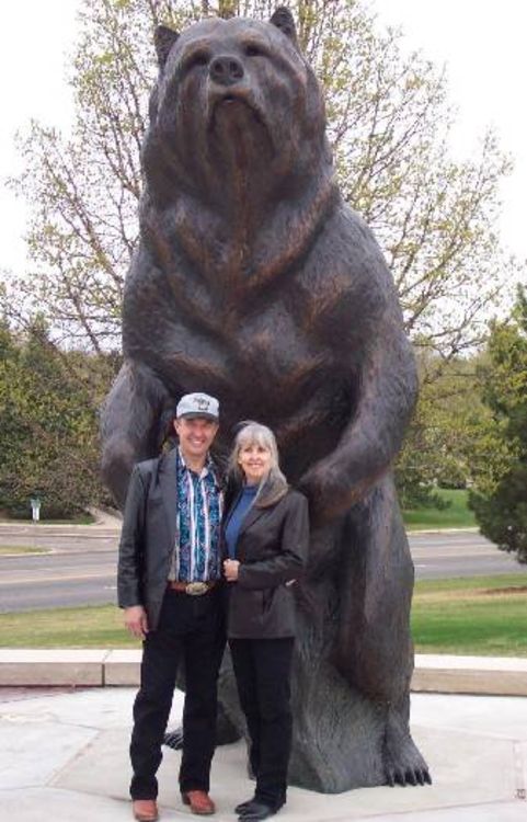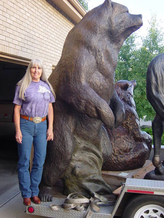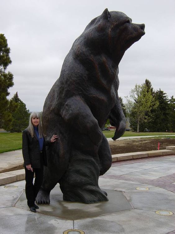 This Monumental Grizzly bear is patinaed in normal bronze color with highlights throughout the piece BUT can be patinaed with light brown back which makes it look like the sun has bleached the hair as seen on a real Grizzly during the summer. This same Grizzly is also completed as an 8 foot high edition of 15 and this Grizz has 2 different sizes of table-sized bronze replicas still available in editions of 50 each. All Dawn's LARGE Bronzes are sculpted in such a way that there is a lot of movement and personality in each piece and the pictures do not do them justice! It is easy to install and we personally deliver, installation ready, to anywhere within the continental US at NO CHARGE. We also will advise as to installation of each piece. This piece was commissioned by Univ of Northern Colorado and the first two pictures show the installation in 2004. The last picture shows the 8ft high version of this Grizz on one of Dawn's 2 trailers. The one dark looking picture shows this Grizz at night just before the sun has gone down...pretty eerie! Only one (1) of these Grizzly bears will be allowed in the same school division/league so as to keep them unique thru out the nation to each school within that league/division!